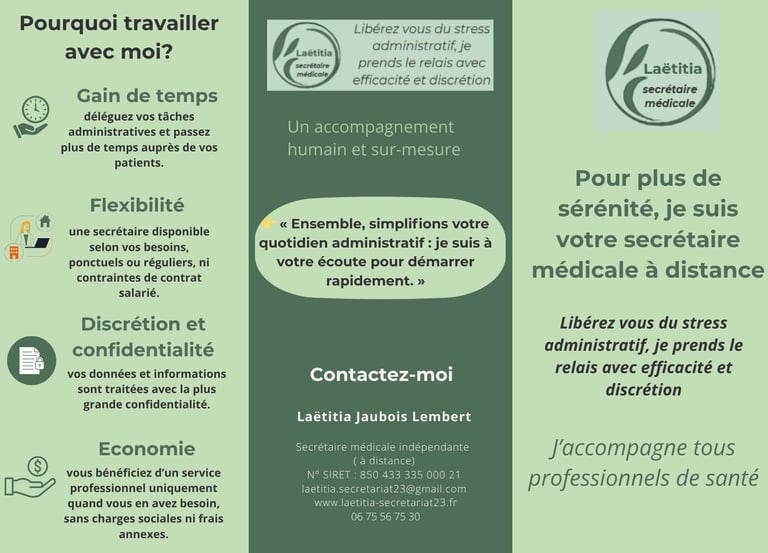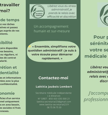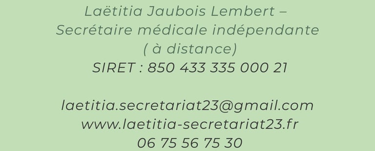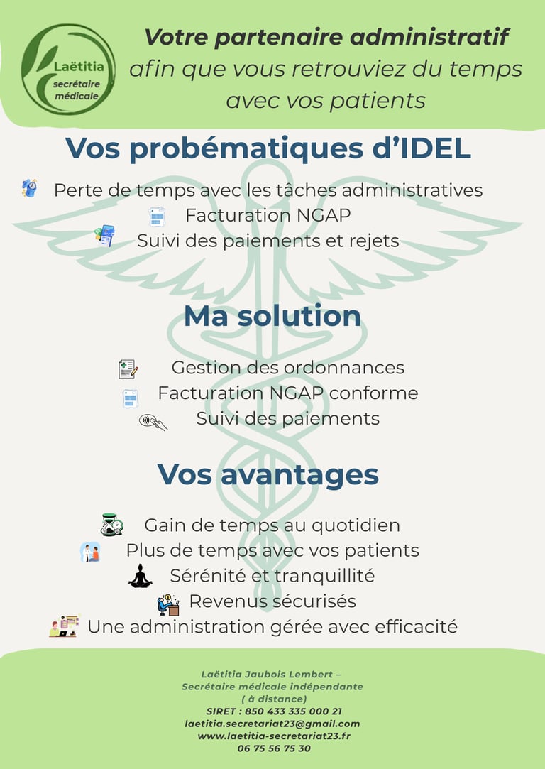 Anciennement aide-soignante, j’ai toujours eu à cœur d’apporter du soutien et de la sérénité dans le quotidien des autres. Aujourd’hui, en tant que secrétaire indépendante spécialisée dans le secteur médical et paramédical, j’accompagne les IDEL, cabinets médicaux, paramédicaux, mais aussi les artisans, TPE et indépendants dans leur gestion administrative.