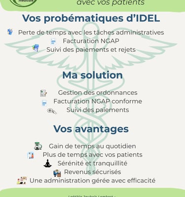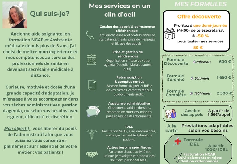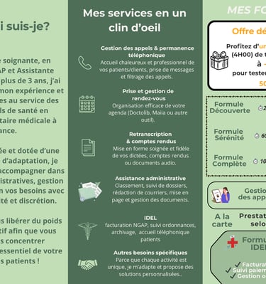 Flyer dédié aux infirmiers et infirmières libéraux – présentation de mes services de facturation, suivi administratif et assistance quotidienne.